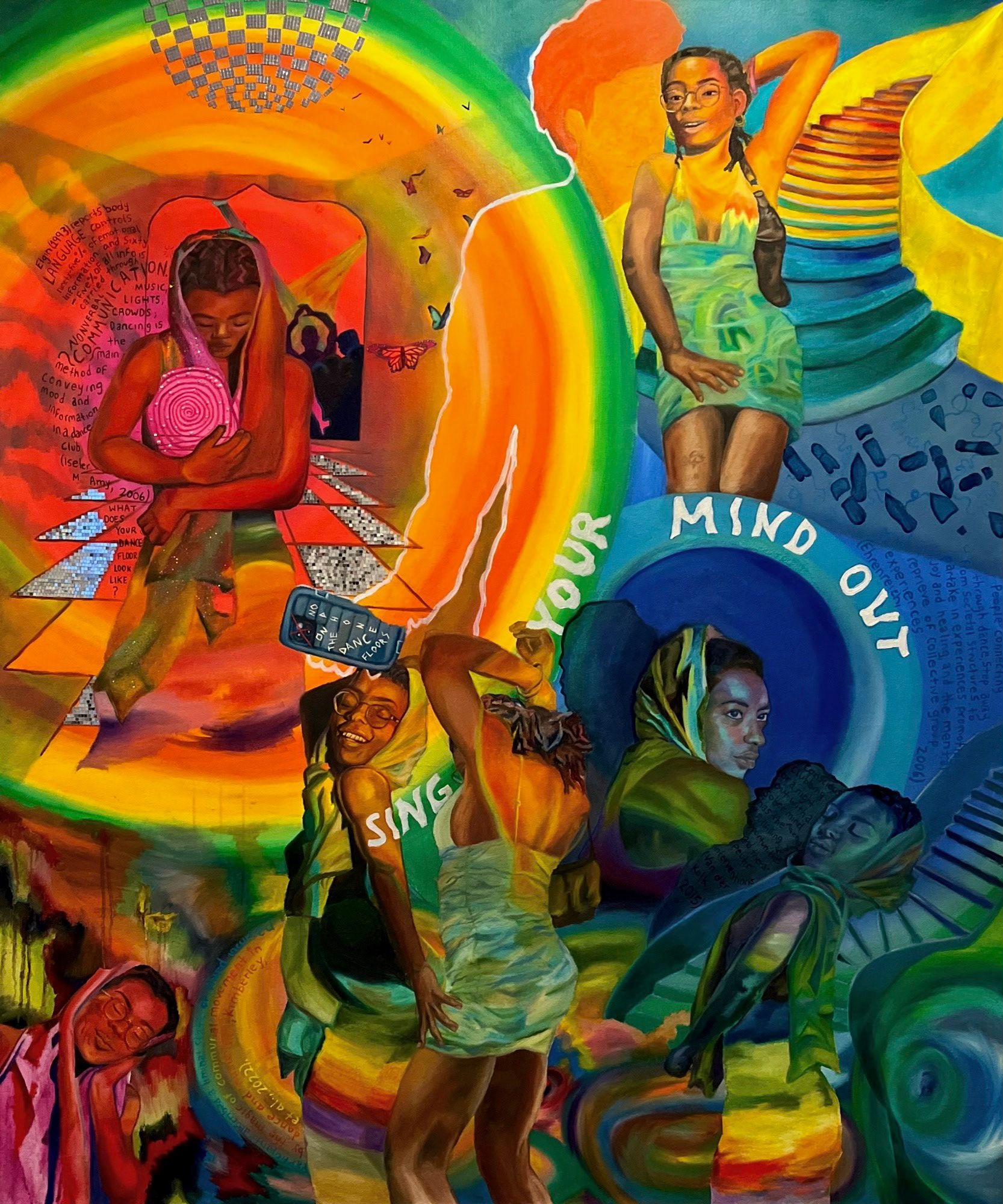 Shared Intentionality: Synchronous Dancing. Acrylic, oil, mirror tiles, glitter and gems on 72" x 60" canvas. 2025. Nia Blue.